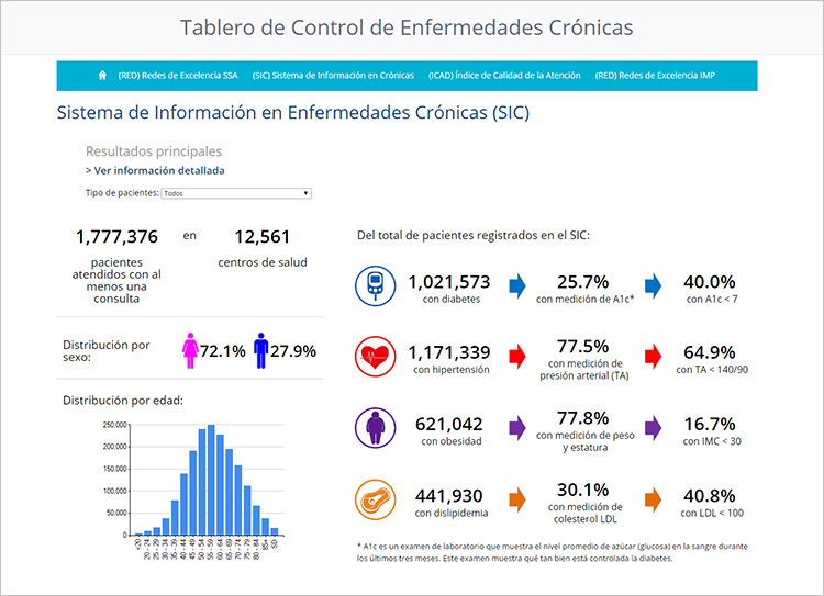 Tablero de control desarrollado para la Fundación Carlos Slim, el cual presenta el análisis de la información de más de 12 mil unidades médicas de la SecretarÃa de Salud, recogidas en todo el proceso de atención al paciente por medio de la Plataforma de Enfermedades Crónicas.
