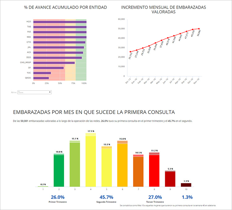 Tablero de control desarrollado para la Fundación Carlos Slim, el cual presenta el análisis de la información de más de 270 unidades médicas y hospitales de la SecretarÃa de Salud, recogidas en todo el proceso de atención al paciente por medio de la Plataforma de Salud Materna.